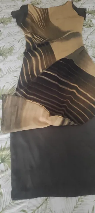 Elegante vestito longuette con un design unico che valorizza la figura spacchetto laterale anche nea sottoveste di color scuro in contrasto Fantasia astratta con sfumature dal beige al marrone e oro. Tessuto leggero e fluido. Taglio asimmetrico, manichette corte aperte sulla spalla Si compone di due pezzi pur essendo un abito unico. taglia italiana 42