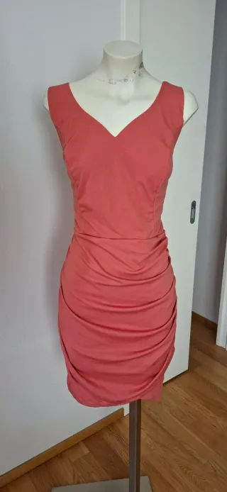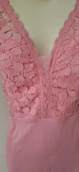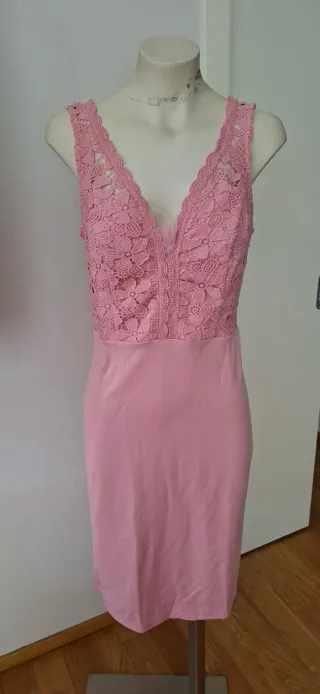 Elegante abito rosa con dettagli in pizzo. Abito da cerimonia nuovo con cartellino. Lavorato sulla parte superiore. Elasticizzato si adatta bene al corpo risaltando le forme Misura ascelle 38 cm lunghezza 100 cm - Scollo a V con inserto in pizzo floreale. - Tessuto morbido e confortevole. - Lunghezza al ginocchio.