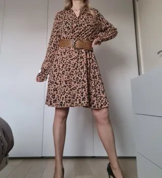 Elegante abito con stampa maculata, perfetto per ogni occasione. Nuovo e mai indossato. - Scollo a V. - Maniche lunghe. - Cintura elastica in vita. - Gonna svasata. La cintura in foto in cuoio è mia, si può mettere quella che si preferisce