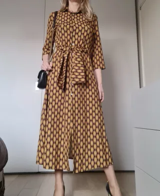 Bellissimo vestito in fantasia geometrica, lunghezza midi, stile camicia con bottoni frontali che arrivano alla vita. Cintura in vita che permette di regolare la larghezza. Taglia unica. New Collection