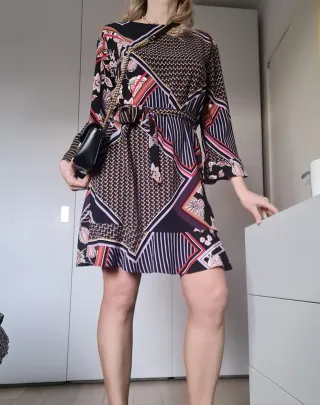Elegante abito Marella con una vivace fantasia. - Maniche a campana. - Cintura in vita con fiocco. - Lunghezza al ginocchio.
