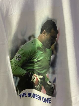 Maglietta celebrativa della Lazio dedicata ad Angelo Peruzzi, The Number One. - Stampa grafica di Peruzzi con guantoni. - Scritta THE NUMBER ONE in blu.