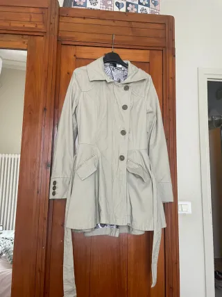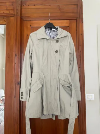 Elegante trench color beige, perfetto per completare il tuo look. - Chiusura con bottoni. - Cintura in vita. - Tasche frontali. - Dettagli sulle maniche. - Chiusura con cerniera