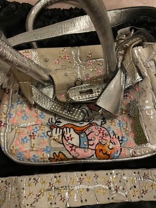 Si tratta di un set acquistato nei primi anni 2000 e usato pochissimo. Sono entrambe in pelle di eccezionale qualita.La borsa ha le dimensioni di 21x14x10cm. Ha la tracolla abinata e l’interno in raso rosa,e’ molto capiente per le dimensioni che ha. Presenta un lucchetto e chiavetta per chiuderla,scritte frasi tipiche della creatrice. Design unico,Danila del Forte realizzava solo pezzi unici. La cintura misura 1 metro con 4 cm di larghezza e 2 cm di spessore. La borchia e ovale e tempestata di Swarovski incastonati,utilizzata pochissime volte perché sono rimasta incinta subito dopo l’acquisto.