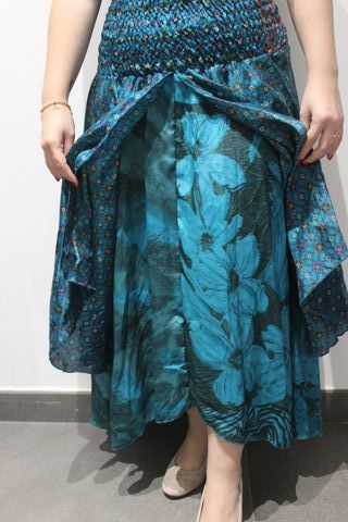Gonna lunga e ampia con cintura in tessuto elasticizzato, avvolta con una lunga balza colore su colore. M26