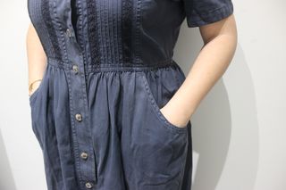 Vestito lungo blue, manica corta, scollo quadrato, tagliato in vita con apertura frontale e chiusura con bottoni. (M13)