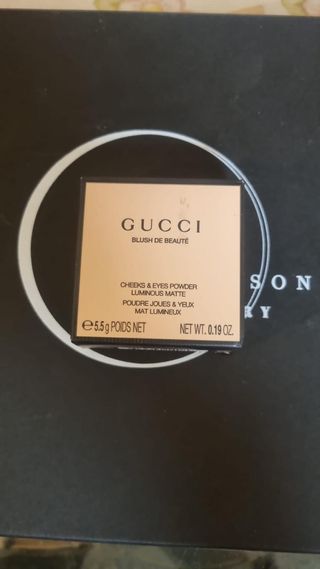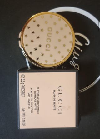 Questo è un blush Blush de Beauté di Gucci, con una finitura Luminous Matte. La confezione presenta un design con stelle dorate e nere. - Polvere per guance e occhi. - Finitura luminosa opaca. - Peso netto: 5,5 g / 0,19 oz.