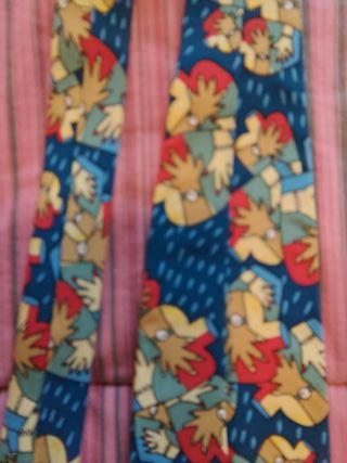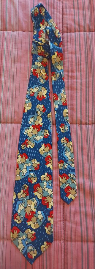 Cravatta vintage specially designed by Brànemark edizione speciale per il 30° anniversario, fantasia con personaggi stilizzati e gocce, colori vivaci su sfondo blu, 100% seta.