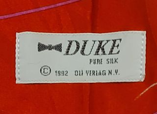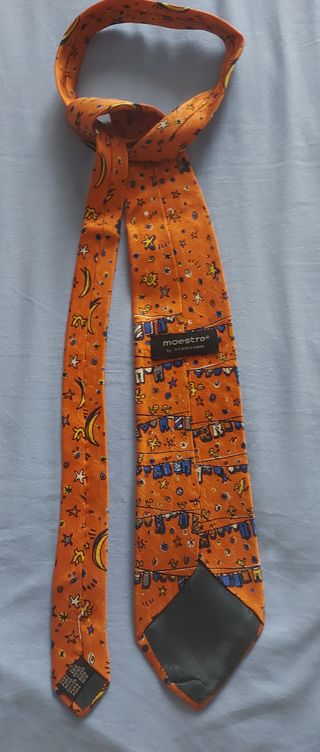 Cravatta vintage Maestro by Striessnig con un design unico e colorato pura seta, fantasia con lune, stelle e figure stilizzate, motivo centrale con panni stesi e figure, colori vivaci su sfondo arancione; pura seta