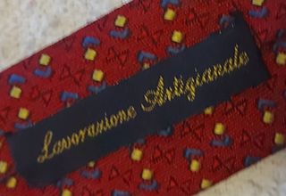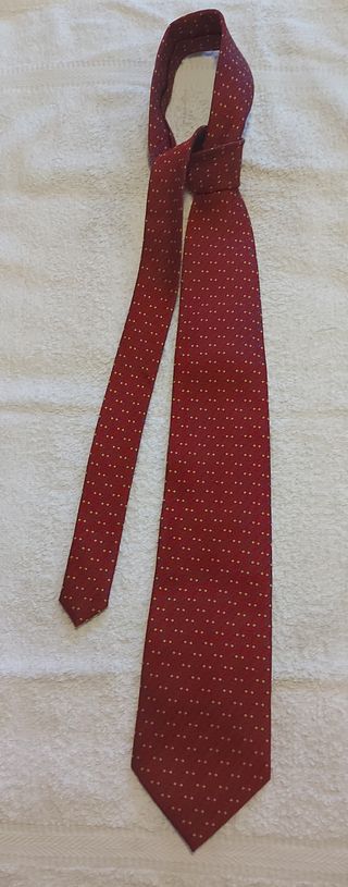 Elegante cravatta in seta con un motivo a pois, colore rosso con pois oro, lavorazione originale, un accessorio classico per completare il tuo look.