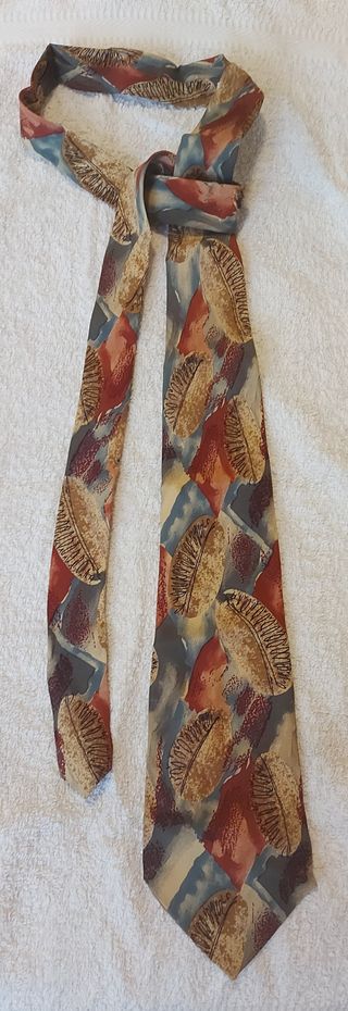 Cravatta Tiziana Bossi fantasia geometrica, elegante con una fantasia astratta e colorata. Tessuto setoso, motivo geometrico e fogliaceo con colori vivaci e sfumati; 100% seta.