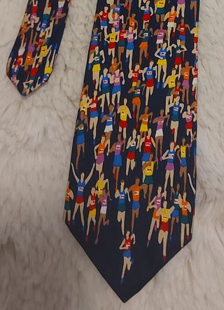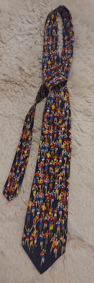 Cravatta vintage creative american design alynn neckwear marathon con un divertente motivo di corridori in maratona, design unico con persone che corrono in varie pose, colori vivaci su sfondo blu scuro; 100% seta.