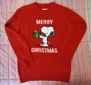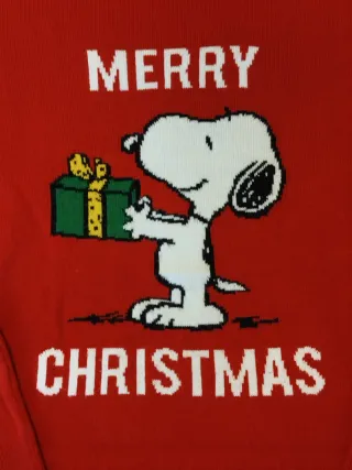 Maglioncino unisex a tema natalizio con Snoopy. - Design con Snoopy che tiene un regalo. - Scritta Merry Christmas sul davanti. - Colore rosso vivace.