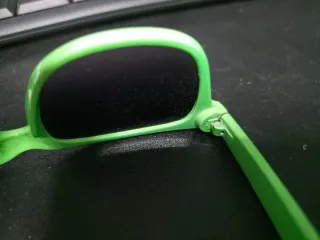 Occhiali da sole Ray-Ban con montatura verde brillante. Un accessorio di stile per ogni occasione. - Montatura in plastica resistente. - Lenti scure per una protezione ottimale. Una lente ha un leggerissimo graffio molto piccolo mentre una delle astine e da pulire vicino alla scritta Rayban.