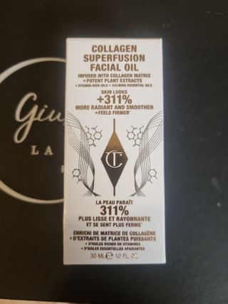 Olio viso Charlotte Tilbury Collagen Superfusion. - Infuso con matrice di collagene. - Estratti vegetali potenti. - Oli ricchi di vitamine e oli essenziali calmanti. - La pelle appare più radiosa e levigata. - Sensazione di maggiore compattezza. - 30 ml / 1.0 FL. OZ.