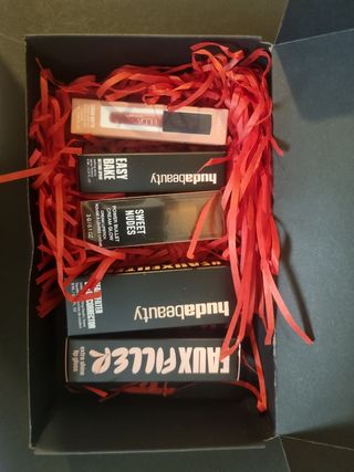 Set di prodotti Huda Beauty, ottimo come idea regalo. - Liquid Matte - Easy Bake Setting Spray - Sweet Nudes Power Bullet Cream Glow - #FauxFilter Luminous Matte Liquid Foundation - Faux Filler Extra Shine Lip Gloss