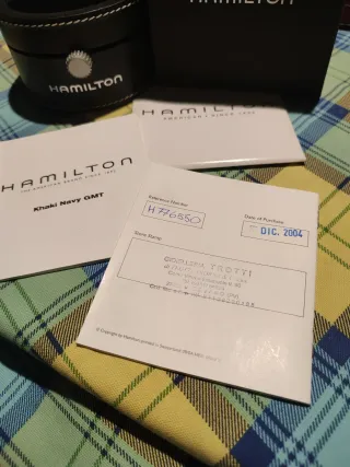 Scatola originale per orologio Hamilton Khaki Navy GMT. Include la scatola esterna, la scatola interna e i documenti. - Riferimento: H776550 - Data di acquisto: Dicembre 2004 - Rivenditore: Gioielleria Trotti