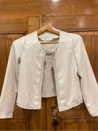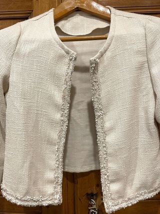 Bellissima giacchina in tessuto bouclé, colore panna. - Design senza collo. - Orlo e bordi con frange decorative. - Maniche lunghe. - non ha bottoni - sfoderata calda ed elegante / invernale adatta ad una taglia 42 elegante ma anche sportiva ideale per le feste stupenda 🤩 morbidissima