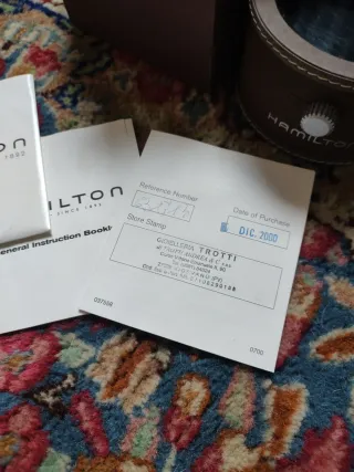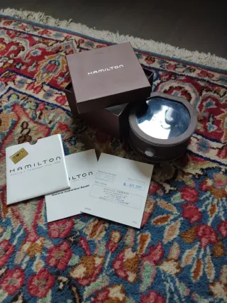 Scatola originale per orologio Hamilton, colore marrone. - Include scatola esterna e contenitore interno. - Presente documentazione originale: manuale istruzioni e certificato di acquisto.