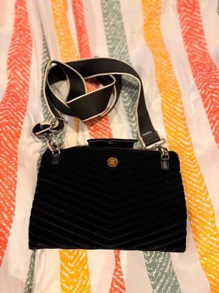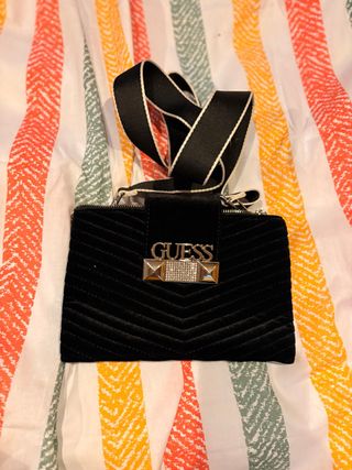 Elegante borsa Guess in velluto nero con dettagli dorati. - Design trapuntato a V. - Logo Guess frontale. - Dettagli con strass e borchie.