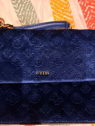 Elegante borsa Guess in velluto blu, perfetta per aggiungere un tocco di stile. - Materiale: Velluto - Colore: Blu - Logo Guess dorato a rilievo
