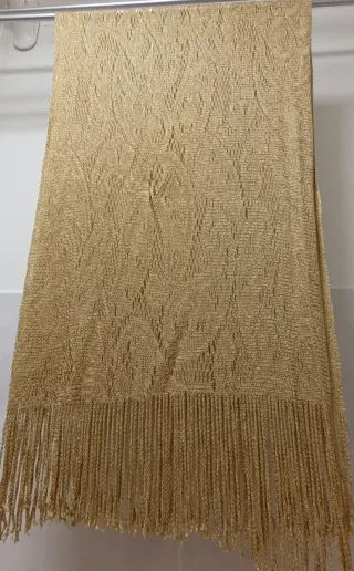 Elegantissima e raffinata stola o sciarpa elasticizzata luccicante con frange colore oro brillante. Trama traforata. Ideale da sera.