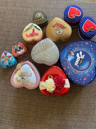 Set di scatoline a forma di cuore, perfette per conservare piccoli oggetti o come decorazione. - Scatola a forma di cuore con disegno di Topolino e Minnie, anno 1965. - Scatola a forma di cuore con disegno di Topolino e amici, anno 1970. - Scatola a forma di cuore con disegno floreale. - Scatola a forma di cuore in metallo con decorazione. - Scatola a forma di cuore in tessuto dorato con ricamo floreale. - Scatola a forma di cuore rossa con fiocco. - Scatola a forma di cuore con disegno di orsetto. - Scatola a forma di cuore con decorazione a rombi. - Scatola a forma di cuore blu con stelline e cuoricini, marca Baci Perugina. - Due