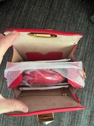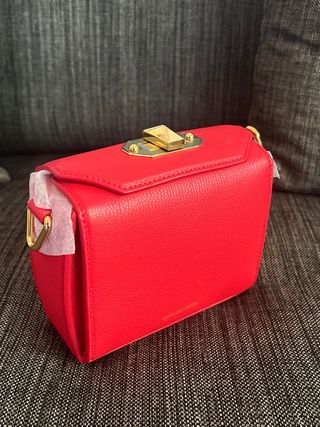 Borsetta Scatola rossa di Alexander McQueen 19: NUOVA MAI USATA ANCORA INCELOFANATA - originale, con numero di serie - in pelle, nappa di capra - una tracolla piatta regolabile e una tracolla a catena color oro rimovibile - un risvolto superiore con chiusura a chiave, e tasche interne con zip e slip - fibbia e borchie con effetto satinato Dimensioni: Lunghezza: 15 cm Larghezza: 19 cm Profondità: 7 cm