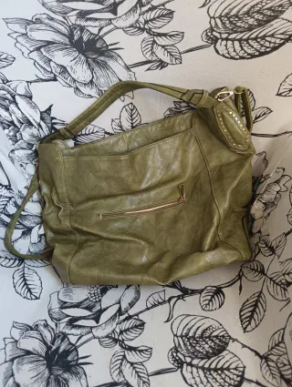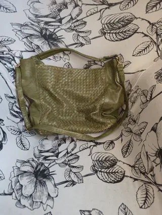 Borsa grande in ecopelle color verde oliva, con trama intrecciata sul davanti e dettagli dorati. - Manico superiore. - Tracolla regolabile e removibile. - Chiusura con zip. - Tasca interna con zip.