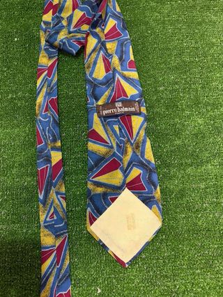 Elegante cravatta Pierre Balmain Paris. - Fantasia geometrica con triangoli. - Colori vivaci: blu, giallo e bordeaux. - Tessuto in seta.
