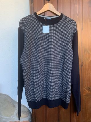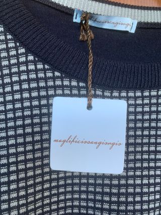 Maglia girocollo elegante del marchio italiano Maglificio San Giorgio. Qualità eccellente: 80% Lana Merino e 20% Viscosa. Design bicolore con fantasia geometrica (davanti) e tinta unita blu (maniche/retro). Taglia 54 (veste XL/XXL). Misure: larghezza da ascella ad ascella cm 60 lunghezza cm 72 Made Italy