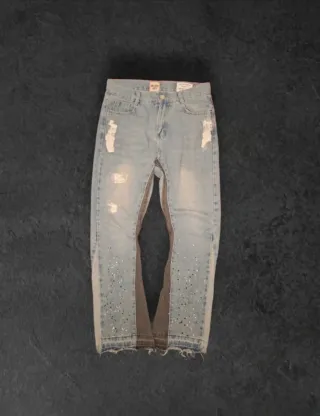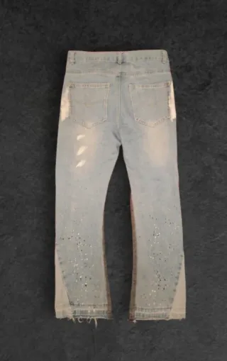 Pantaloni Gallery Dept con un design unico. - Gamba a zampa d'elefante. - Dettagli strappati. - Macchie di vernice. - Inserti in tessuto a contrasto.