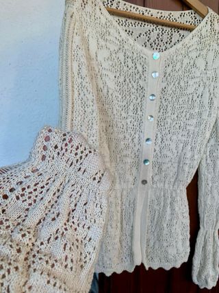 Maglia/Cardigan leggero in misto cotone. NUOVO, mai indossato! Capo di alta qualità. Taglia: L/XL Vestibilità aderente (stile peplum). Materiale: 57% Cotone. Dettagli: Bottoni in vera Madreperla. Lavorazione traforata.