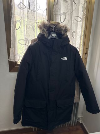 Giubbotto The North Face di colore nero, con cappuccio bordato in pelliccia sintetica. - Chiusura frontale con zip. - Due tasche anteriori con patta. - Logo The North Face sul petto.