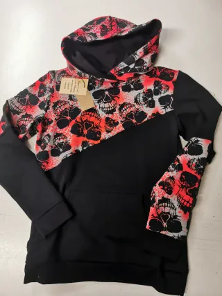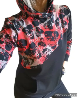 Felpa con cappuccio dal design audace e accattivante. - Stampa all-over di teschi rossi e neri. - Tessuto morbido e confortevole. - Cappuccio avvolgente. TG. S veste 40/42 taglia italiana Misure: lunghezza 60cm, torace 46cm, spalle 37cm, manica 60cm Nuova con cartellino, made in Italy