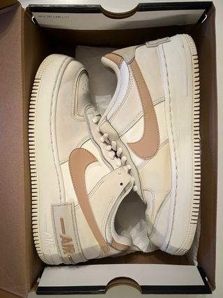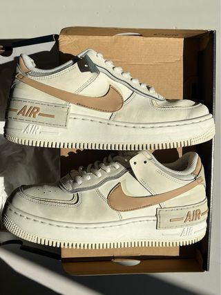nike air force 1 shadow in the colouration of sail/hemp-fossil-light bone with their original box and packaging. they’re super comfortable, and they have been thoroughly washed and cleaned before putting them up for sale. please note there are two holes from signs of wear (pic 5) in the back (please look at all the pictures before purchasing).