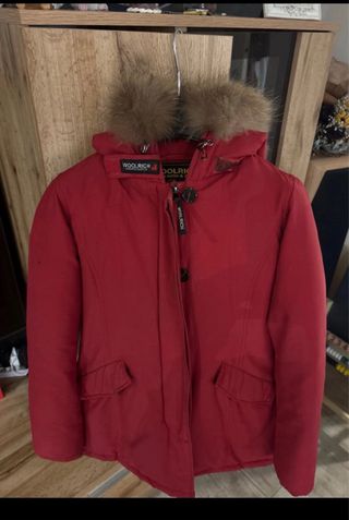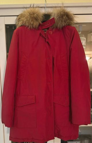 Parka Woolrich di colore rosso con cappuccio. - Chiusura con zip e bottoni. - Tasche frontali e tasche scaldamani sul petto. - Dettaglio logo sul colletto. Originale, indossato pochissime volte.