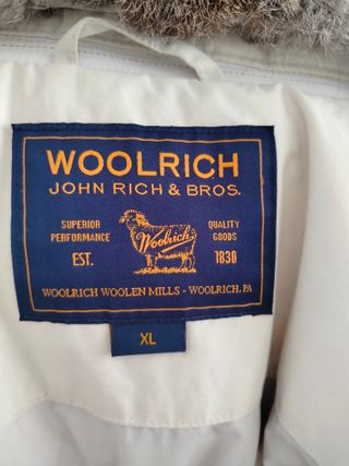 Giubbotto Woolrich originale, modello John Rich & Bros. - Logo Woolrich con pecora. - Dettaglio Superior Performance Quality Goods 1830. - Scritta Woolrich Woolen Mills - Woolrich, PA.