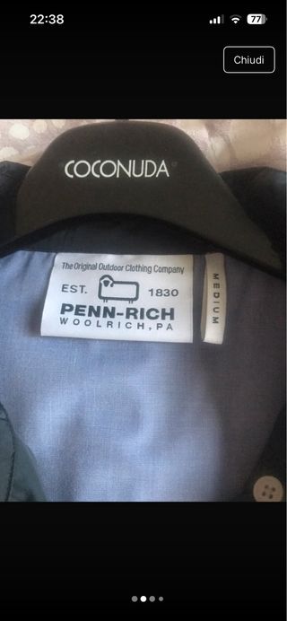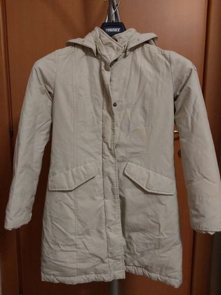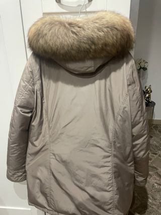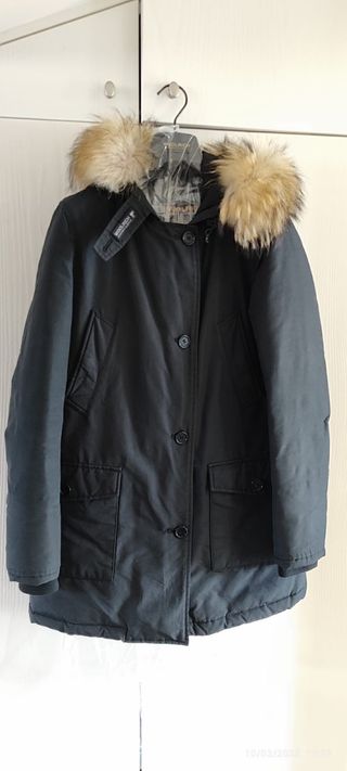 Giubbotto Woolrich. Tessuto in ramar. Cappuccio e pellicciotto staccabili. Chiusura frontale nascosta. Tasche a patta. Polsini a costine scoloriti sul bordo. I bordi sono lucidi per l'uso, in particolare quelli delle tasche e delle maniche(vedi foto) Logo, linguette della cerniera e bottoni delle maniche leggermente raschiati (vedi foto) Parte interna in buone condizioni.