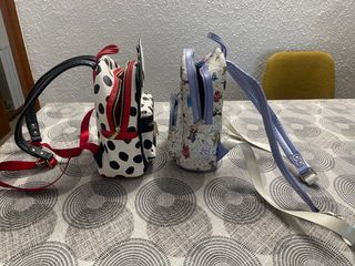 Due zaini a borsa Disney con design unici. - Uno zaino con stampa di dalmata e dettagli in rosso. - Un altro zaino con personaggi Disney e dettagli in lilla.