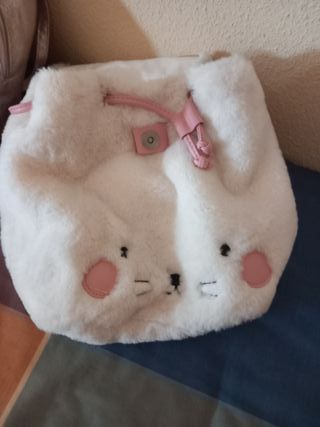 Splendido set composto da 2 zaini e un marsupio per bambini. - Zaino in peluche bianco con orecchie 28x28cm - Zaino rosa glitterato 20x17x8cm - Marsupio rosa stampato 30x10cm