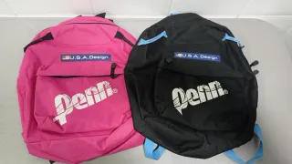Set di due zaini Penn con design USA. - Si vendono insieme per 18.90, separatamente a 9.90 ciascuno. - Uno zaino è rosa. - L'altro zaino è nero. - Entrambi hanno il logo di Penn e U.S.A. Design.