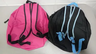 Due zaini blu. Dimensioni: 33 cm di larghezza x 42 cm di altezza. NUOVI.