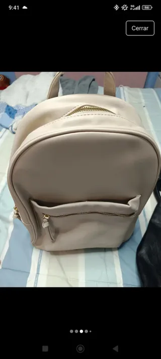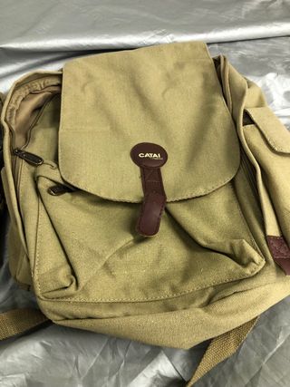 Zaino in tela color beige, con dettagli in pelle, entrambi a 10 euro. Chiusura principale con patta e bottone. Tasca frontale con cerniera. Spallacci regolabili.