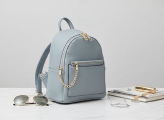 Zaino dallo stile moderno con un design pratico ed elegante. - Scomparto principale con chiusura. - Tasca frontale con cerniera e dettaglio a catena dorata. - Spallacci regolabili per una maggiore comodità. - Finitura testurizzata.