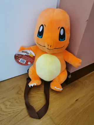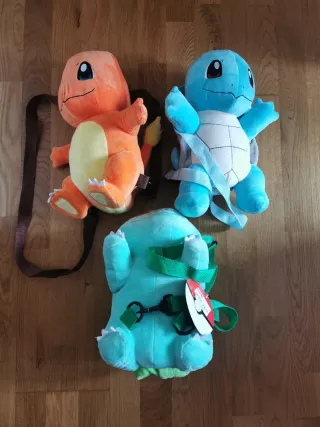 Set di tre zaini in peluche di Pokémon. Design di Charmander, Squirtle e Bulbasaur. Spallacci regolabili per indossarli come zaini.
