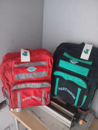 Due nuovi zaini del marchio Martinson, uno in rosso e l'altro in nero con dettagli verdi. Perfetti per l'uso quotidiano o per i viaggi. Ci sono 10 nuovi zaini a 4 euro ciascuno. - Zaino rosso con logo M e dettagli riflettenti. - Zaino nero con logo M e dettagli riflettenti.