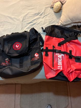In vendita due zaini del marchio Challenge Peguera-Mallorca. Uno è nero e l'altro rosso. - Zaino nero con logo circolare rosso. - Zaino rosso con logo bianco e testo LLORCA.