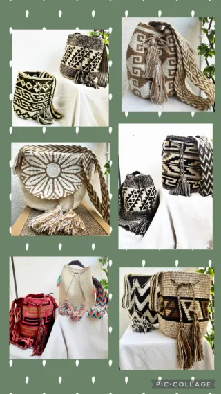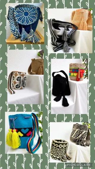 Zaini artigianali della cultura Wayuu, realizzati completamente a mano. Design geometrici e colorati. Tasselli decorativi. Cinturino intrecciato per il trasporto a spalla. Diversi formati, modelli e prezzi.