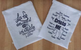 Due zaini con messaggi cristiani ispiratori. Uno ha la frase La fede è come il WiFi, è invisibile ma ti connette. L'altro dice Cristo ME circondato da parole come Libertà, Perdono, Giustificato, Santificato, tra le altre. Design La Fede è come il WiFi. Design Cristo ME con parole chiave. Colore bianco.